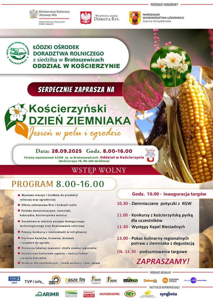 Już w niedzielę 28 września 2025 roku Kościerzyn w gminie Wróblew ponownie stanie się stolicą ziemniaka. Łódzki Ośrodek Doradztwa Rolniczego zs. w Bratoszewicach Oddział w Kościerzynie zaprasza na trzynastą edycję Kościerzyńskiego Dnia Ziemniaka organizowanego pod hasłem „Jesień w polu i ogrodzie”.